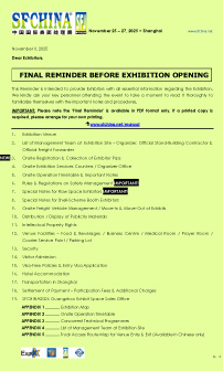 The Final Reminder contains essential information and procedures that Exhibitors need to be aware of prior to the exhibition. Please make sure all staff from Exhibitors attending the event have thoroughly reviewed its contents. Please pay special attention to items marked “NEW!” as they highlight key updates and newly introduced regulations for this year. ATTENTION: Please note the 'Final Reminder' is available in PDF format only. If a printed copy is required, please arrange for your own printing. |